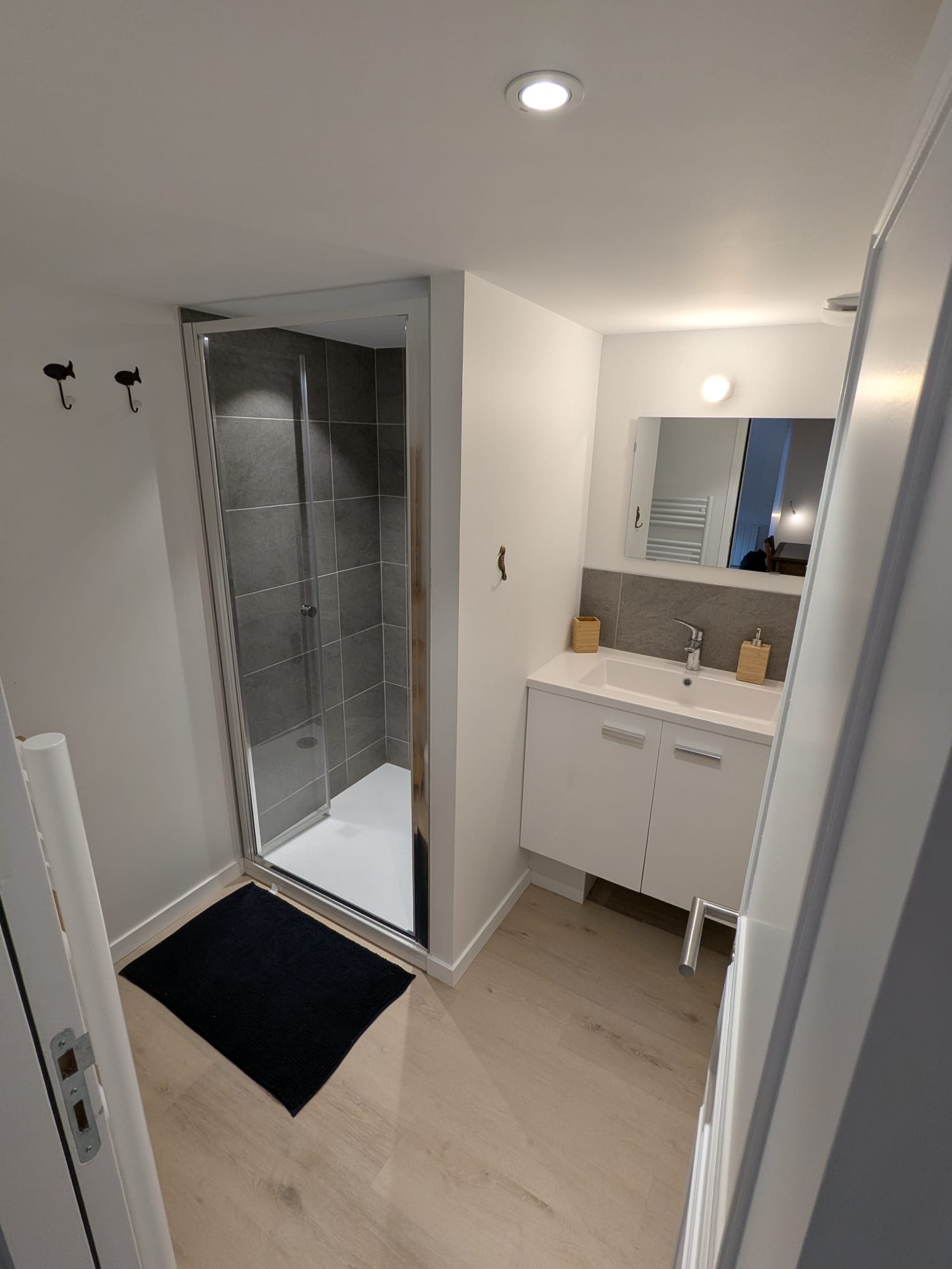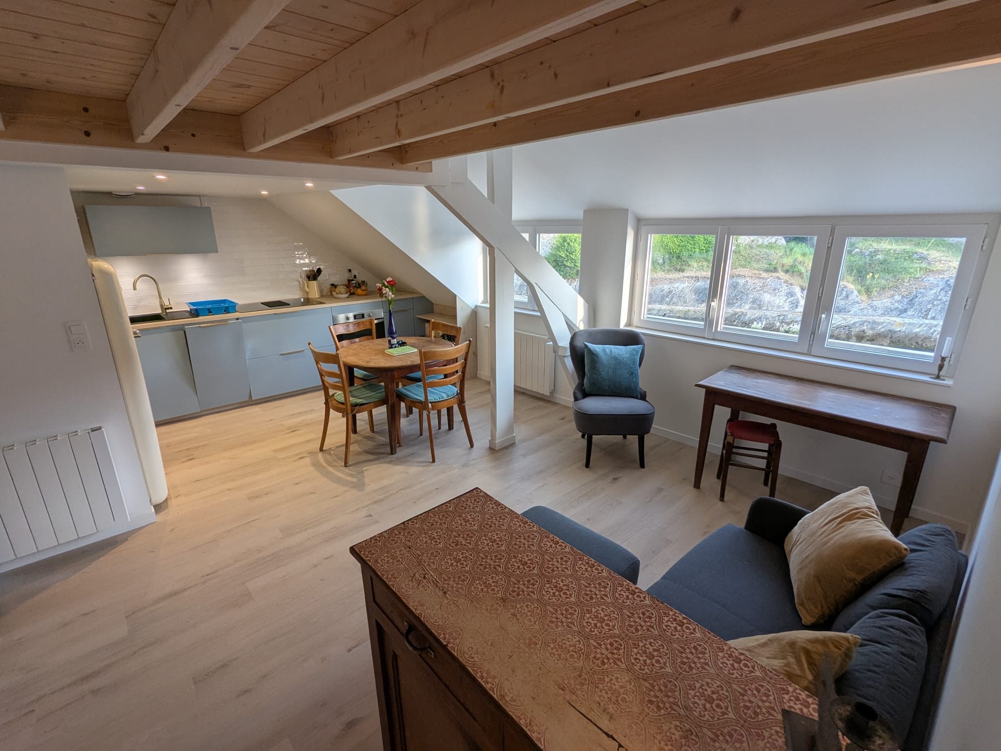 - einem offenen Ess- und Wohnbereich mit gut ausgestatteter Küche (Backofen, Induktionsherd, Filterkaffeemaschine, Geschirrspühler, Waschmaschine, grosser Kühlschrank mit integriertem Gefrierfach)